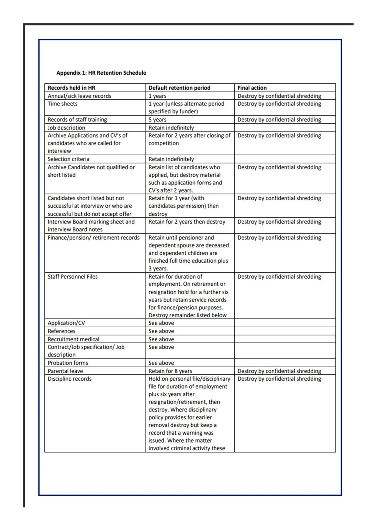 I. Human Resource paper files are maintained securely in locked cabinets with access controlled and limited to the CEO, relevant service managers and the Board of Directors.