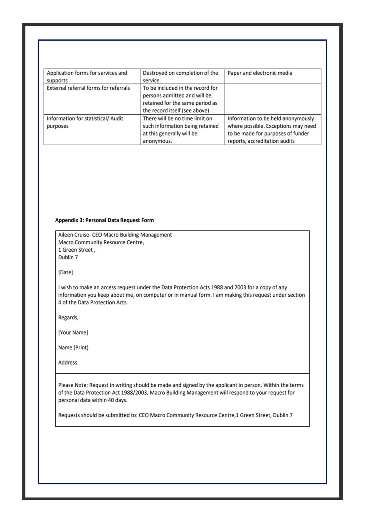 The policy addresses the core principles set out by the Office for Data Protection for compliance and good practice within the current EU Data Protection Legislation. The document is for all Macro Building Management Staff and Volunteers. The office of the Data Protection Commissioner outlines eight principles of data processing which are binding on all organisations who handle personal data.